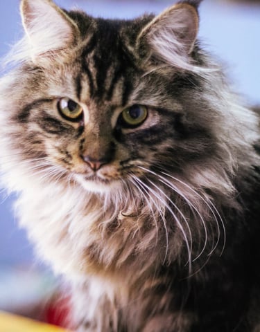 Even as a kitten, he had this striking presence—long fluffy fur, tall expressive ears, sharp eyes that made him look fierce in photos. Yet behind that regal look is a gentle, affectionate soul. Megi became my little shadow, following me everywhere. If I sleep, he sleeps. If I eat, he eats. If I move rooms, he quietly pads along behind me like a tiny guardian who just wants to be part of my day.